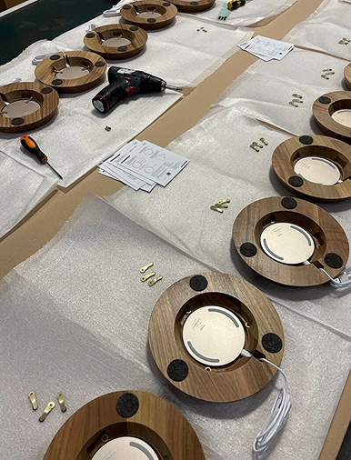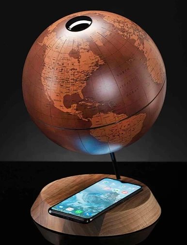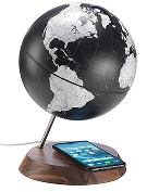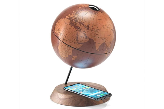 Die Kugel wird von einem schlanken Stahlstab mit modernem und innovativem Design getragen. Schließlich enthält die Walnussholzbasis die echte Neuheit des Modells Bridge: das integrierte kabellose Aufladen.